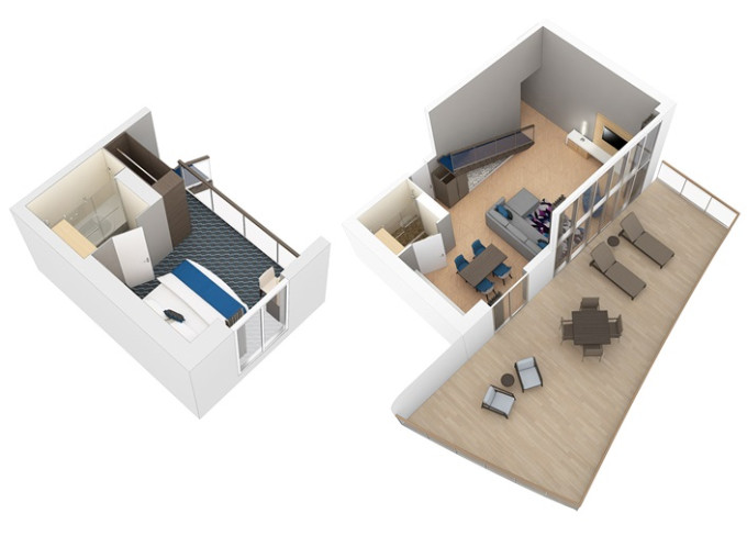 | L1 - Crown Loft Suite s balkónom od 68,5 m² + balkón 13 m². 2-podlažný apartmán. 17. paluba. Max 4 osoby. Výhody Royal Suite Sky Class. | 8 734 € 4 367 € za osobu | ||