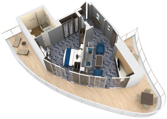 | OS - Owner’s Suite s balkónom 51,5 m² + balkón 22 m². Max 4 osoby. Výhody Royal Suite Sky Class. | 9 198 € 4 599 € za osobu | ||